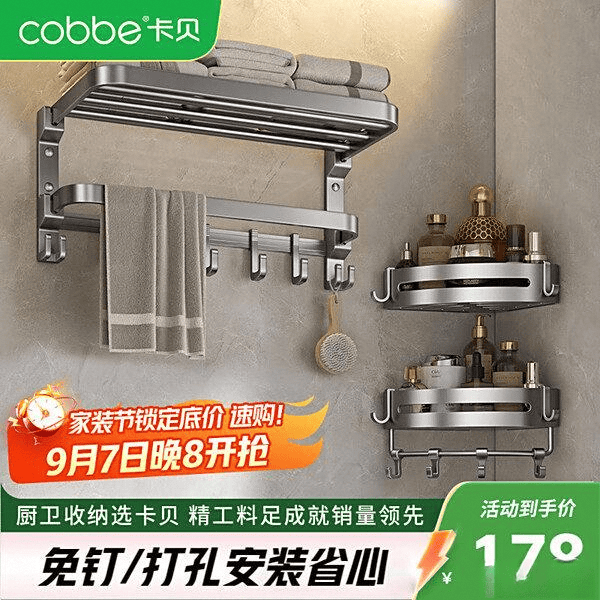 8、卡贝太空铝毛巾架枪灰色卫生间置物架免打孔浴巾架浴室双折叠挂件套装 (京东参考价:295)