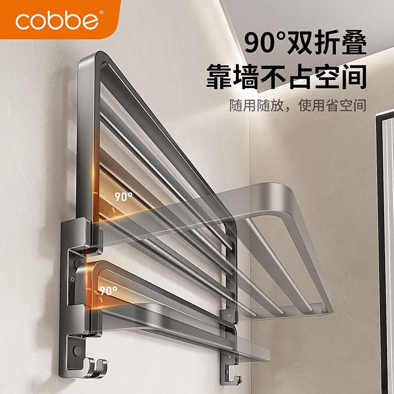 这款毛巾架的90°双折叠设计很实用,使用后可以立刻收起来,节约空间。加宽的台面设计提供了足够的置物空间,适合家庭使用。
