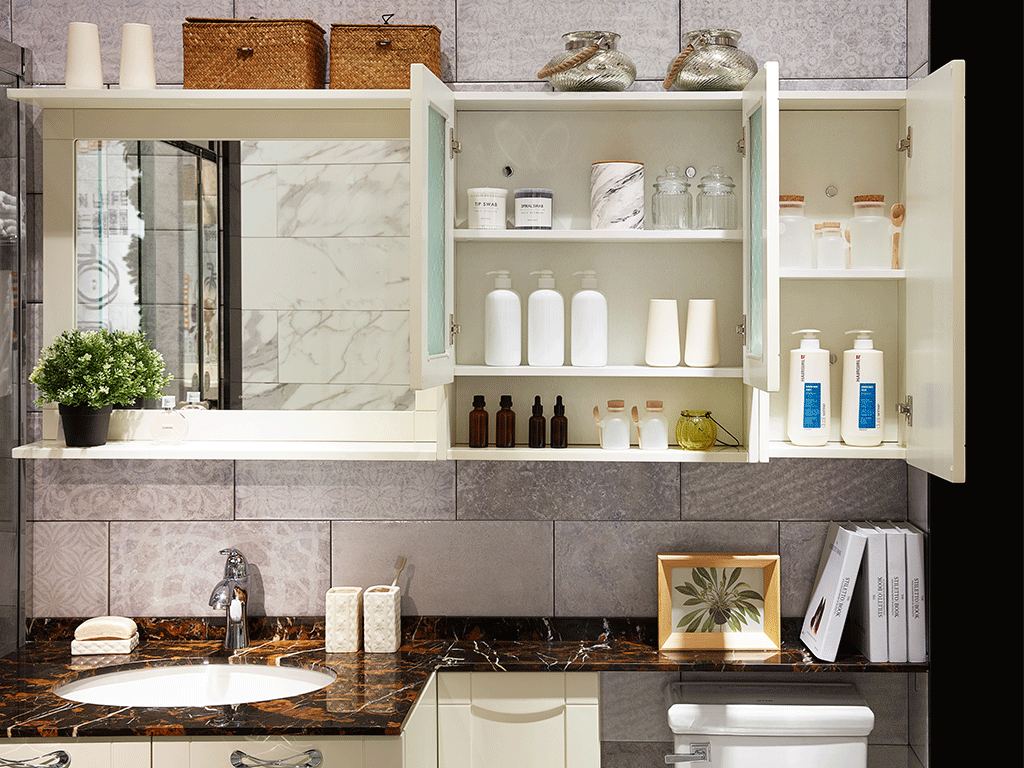 这款澡堂柜的柜体以白色板材为主,体现出纯洁高雅之美;配以暖色大理石台面,高雅之中显得几分温馨柔软。大理石台面的边际线条流通,边角处理圆润润滑,台面细节规划带有几分层次感,用心备至。