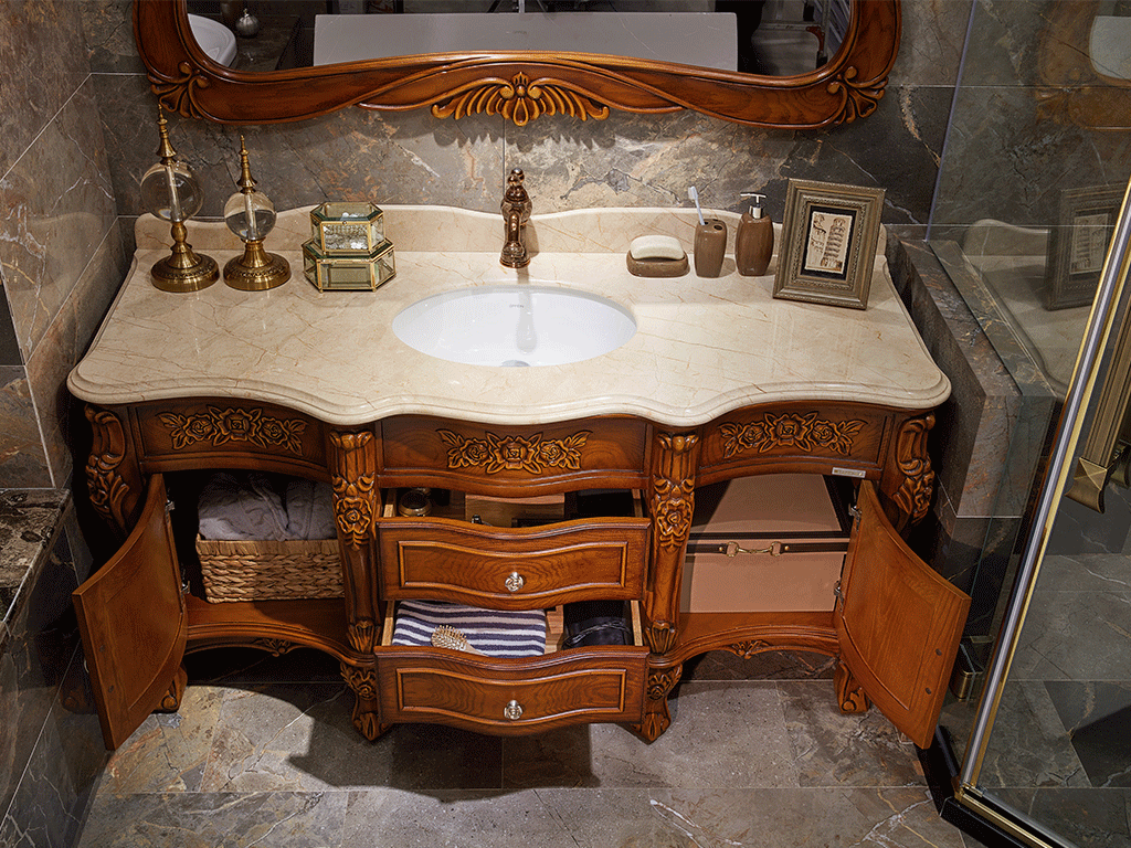 这款澡堂柜从全体造型到雕花配色,无一不显示出古典欧式的显贵与高雅。棕色的柜体调配暖色系的大理石台面,木质与石材的完美的结合,带给人美的感触。全体规划散发出豪华、精美之品尝。