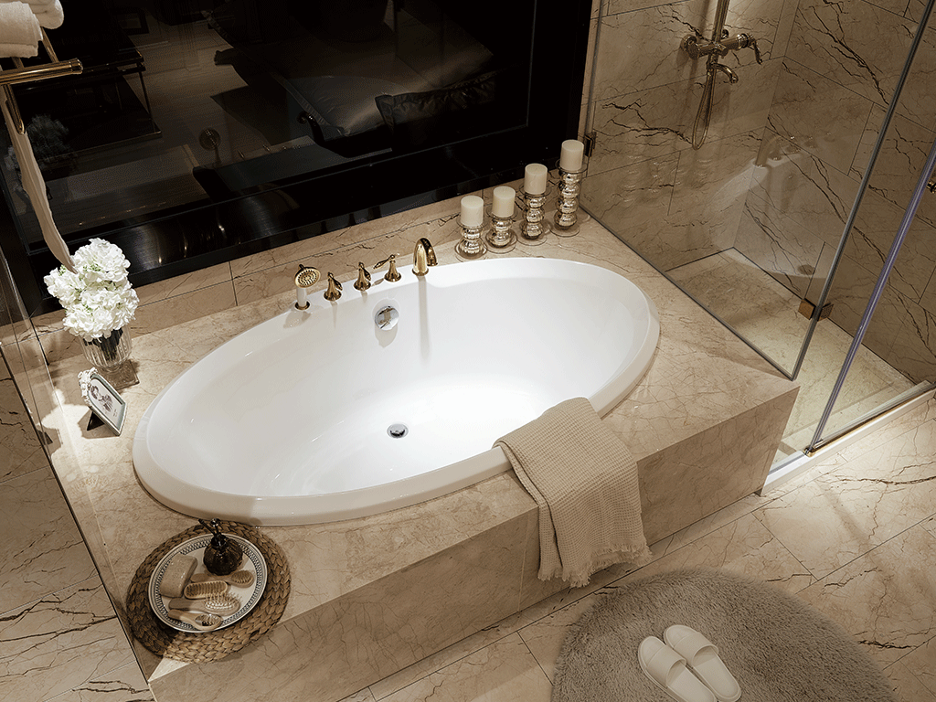 浴缸内嵌于砌高的地台里,提高沐浴的舒适度,也能很好的避免水花四处乱溅;皎白的浴缸调配淡色大理石台面,整个颜色柔软细腻中显示出质量。台面上分布的细细纹路,与瓷砖相照应,天然漂亮,别有风趣。