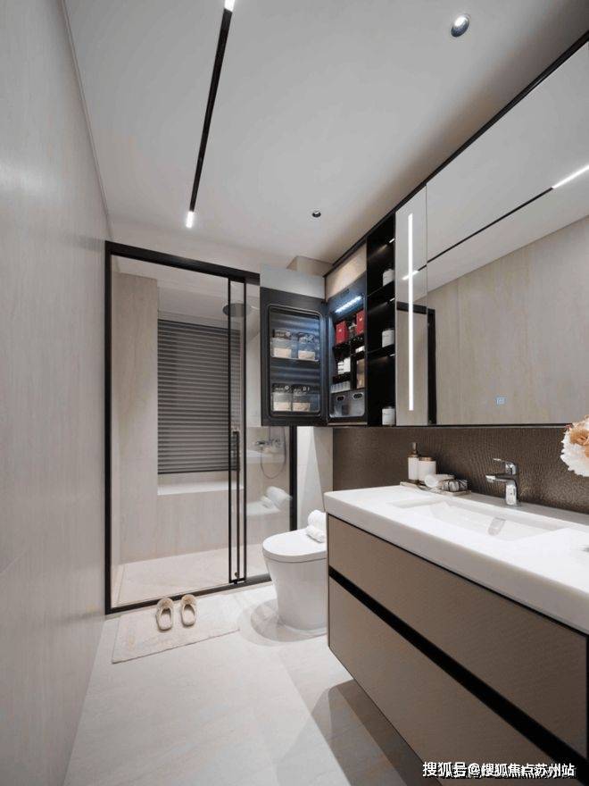 在周末,你能够泡上一杯咖啡,捧上一本书坐在大飘窗上阅尽楼下四季流通。别的,客餐厅一体化弱化了“过道空间”,提高了使用率。“双南套房”规划是另一个亮点。我打了引号,是因为主卧带独卫和阳台,寝息区、衣帽间、卫浴间层层递进。而次卧从动线上看,门口便是公卫,其实也适当于一个套房规划